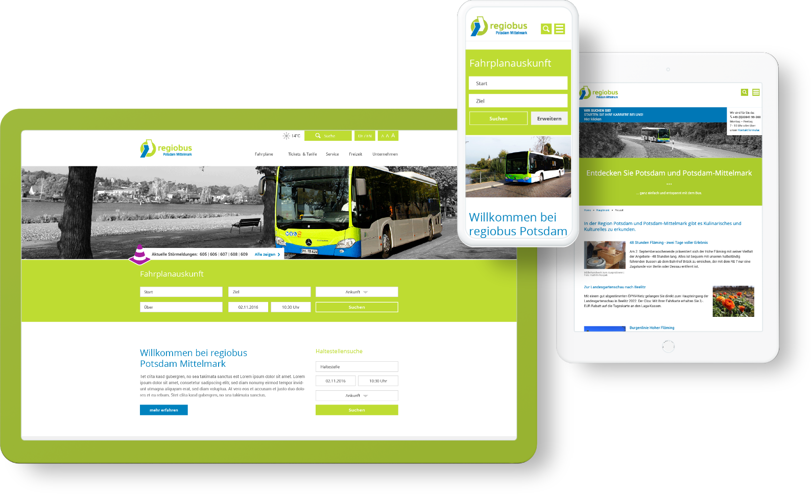 Bei regiobus Potsdam Mittelmark zeichnet sich sowohl die Website als auch der Regionalverkehr von Ort zu Ort durch Zuverlässigkeit und perfekte Zielführung aus. Mit einem Website-Relaunch (2016) beauftragt, sorgte e-pixler für klare Strukturen auf einfachen und übersichtlichen Seiten. Ziel war es, den Website-Nutzer:innen mit wenigen Klicks zu den relevanten Informationen zu führen. Frische, harmonisch aufeinander abgestimmte Farben sorgen dabei zugleich für Lebendigkeit als auch für Wiedererkennung.