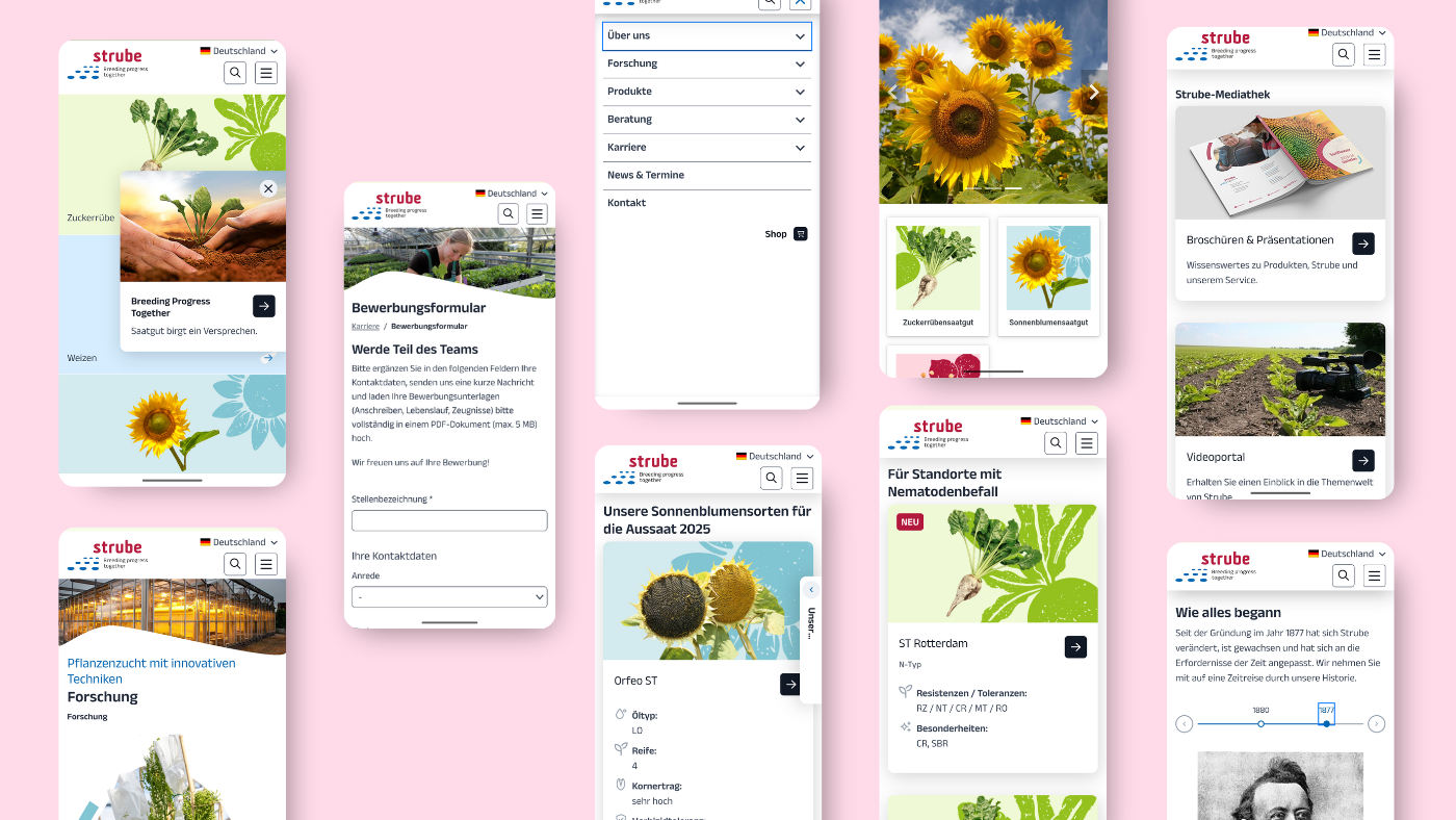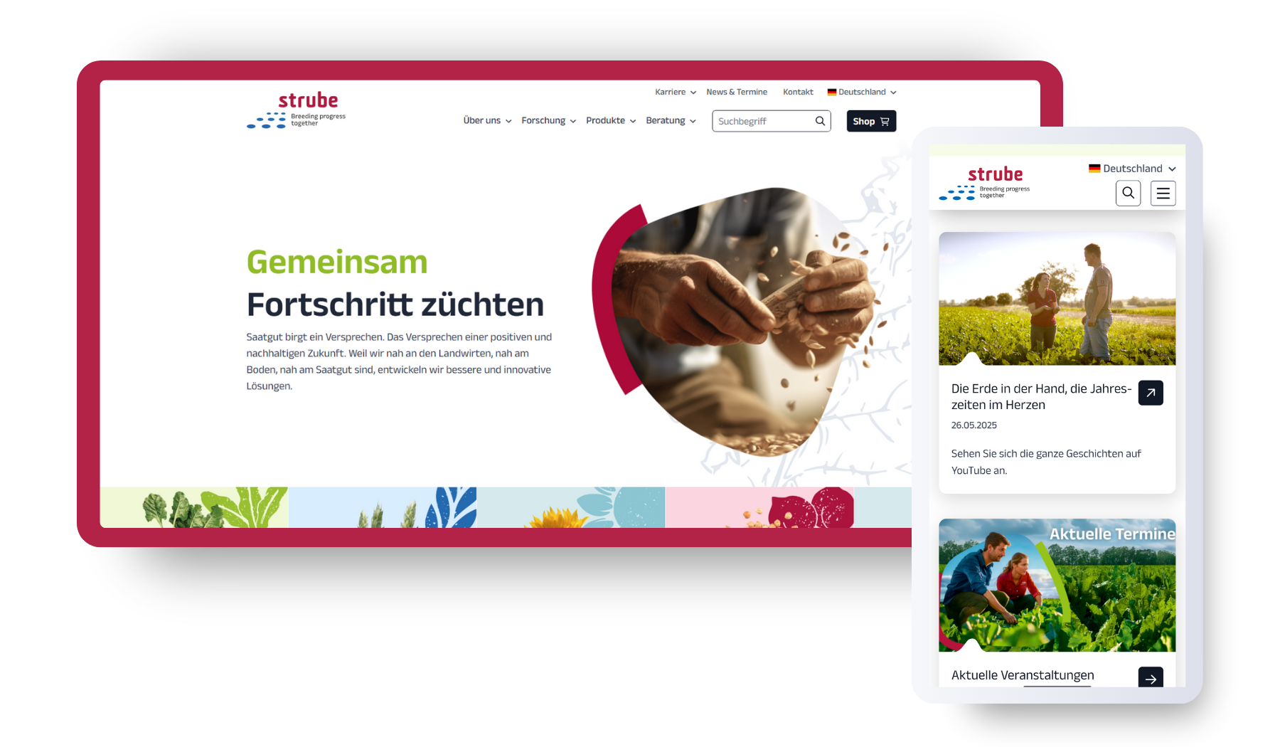 Das traditionsreiche Unternehmen Strube beliefert ca. 40 Länder mit hochwertigem Saatgut. Seit der Gründung 1877 ist es stetig gewachsen und konnte seinen Erfolg weiter ausbauen. Dabei braucht es natürlich auch eine moderne und skalierbare Website. Da Saatgüter auf die jeweiligen Länder abgestimmt und spezialisiert werden, muss der Webauftritt dementsprechend anpassbar und international sein.