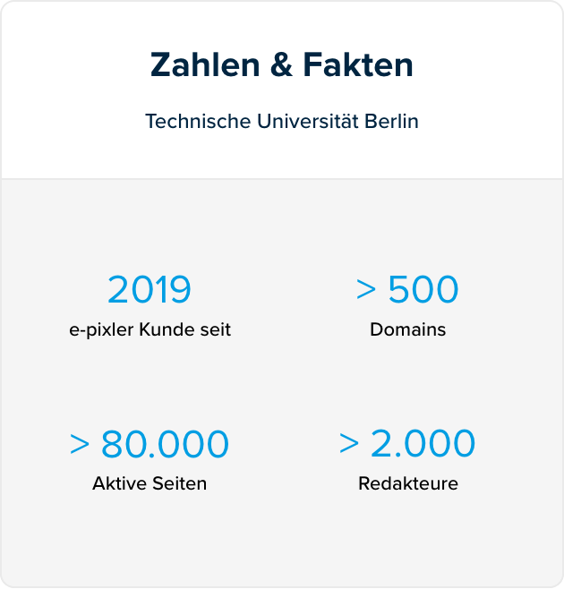 Die TU Berlin hat für ihren Webauftritt einen Relaunch beschlossen und sich dazu externe Unterstützung gesucht. Neben Struktur, Inhalten und Design soll auch die technische Basis optimiert werden. e-pixler hat das System im Sommer 2019 übernommen und wird, gemeinsam mit der IT der TU, die Grundlagen für eine moderne, nutzerfreundliche und wettbewerbsfähige Internetpräsenz geschaffen.